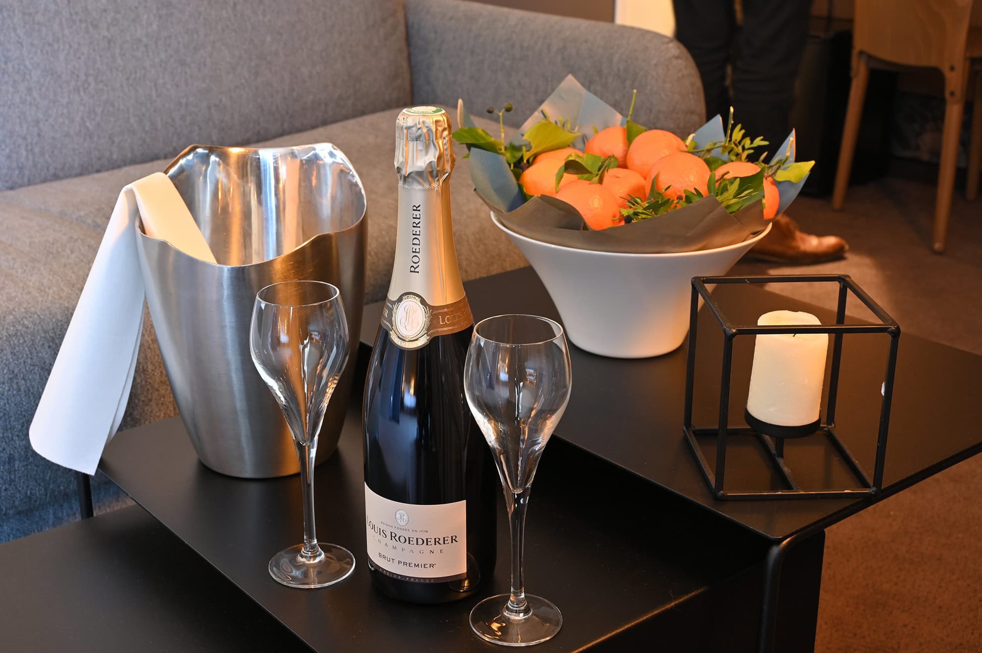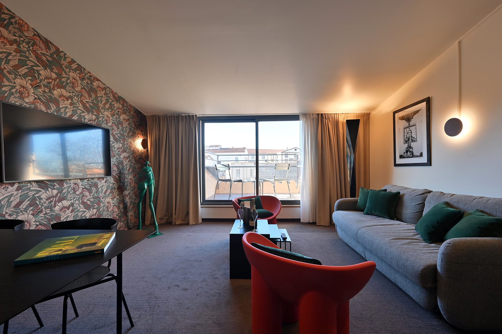 La suite dispose d’un confortable salon avec canapé et fauteuils design, parfait pour un moment de détente ou un apéritif convivial. Un frigo rétro ajoute une touche de style tout en assurant votre confort, tandis qu’un grand dressing avec un espace maquillage dédié vous offre un véritable cocon d’intimité pour vous préparer à votre rythme.
