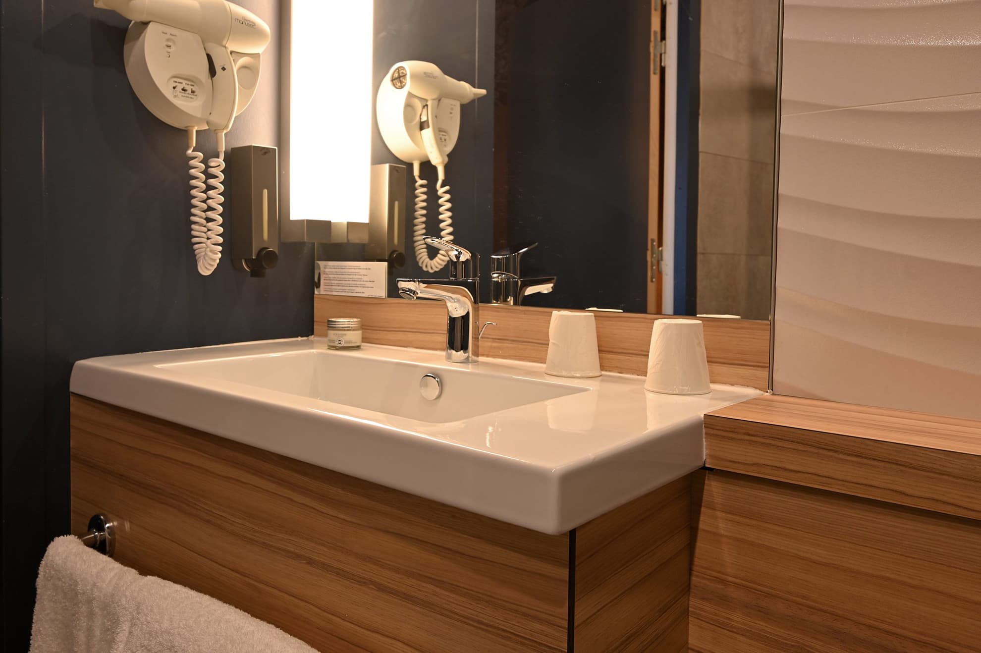 La salle de bain spacieuse vous invite à la détente avec sa grande douche à l’italienne, alliant confort moderne et élégance. Chaque détail de cette suite a été pensé pour offrir un séjour unique, où bien-être et esthétisme se rencontrent harmonieusement.
